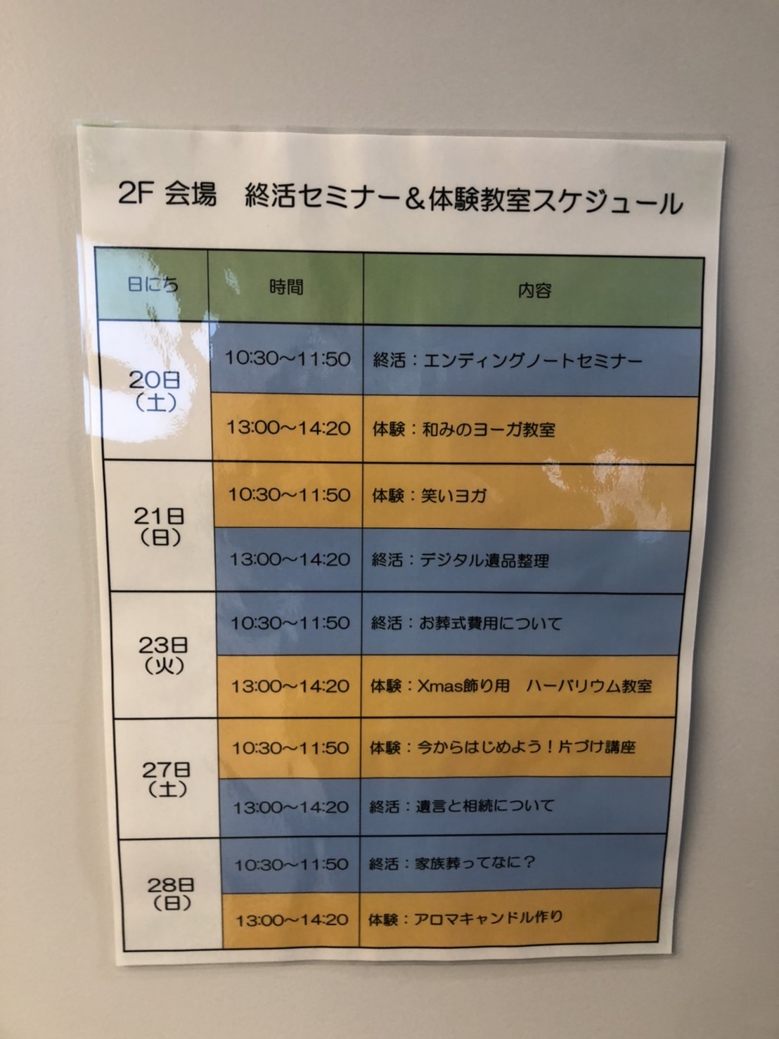 ヨガや片付け講座などの日替わり体験教室、個別相談会、終活セミナーなどの無料セミナーも開催されており、そちらのセミナーにて登壇させて頂きました。