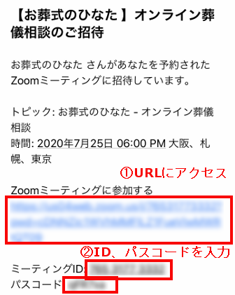 日時が確定後、オンライン会議の招待メールが届きます。時間になりましたらメール記載のhttps://~からはじまるURLにアクセスし、「ミーティングID」「パスコード」を入力すると担当スタッフとのお打ち合わせが開始いたします。